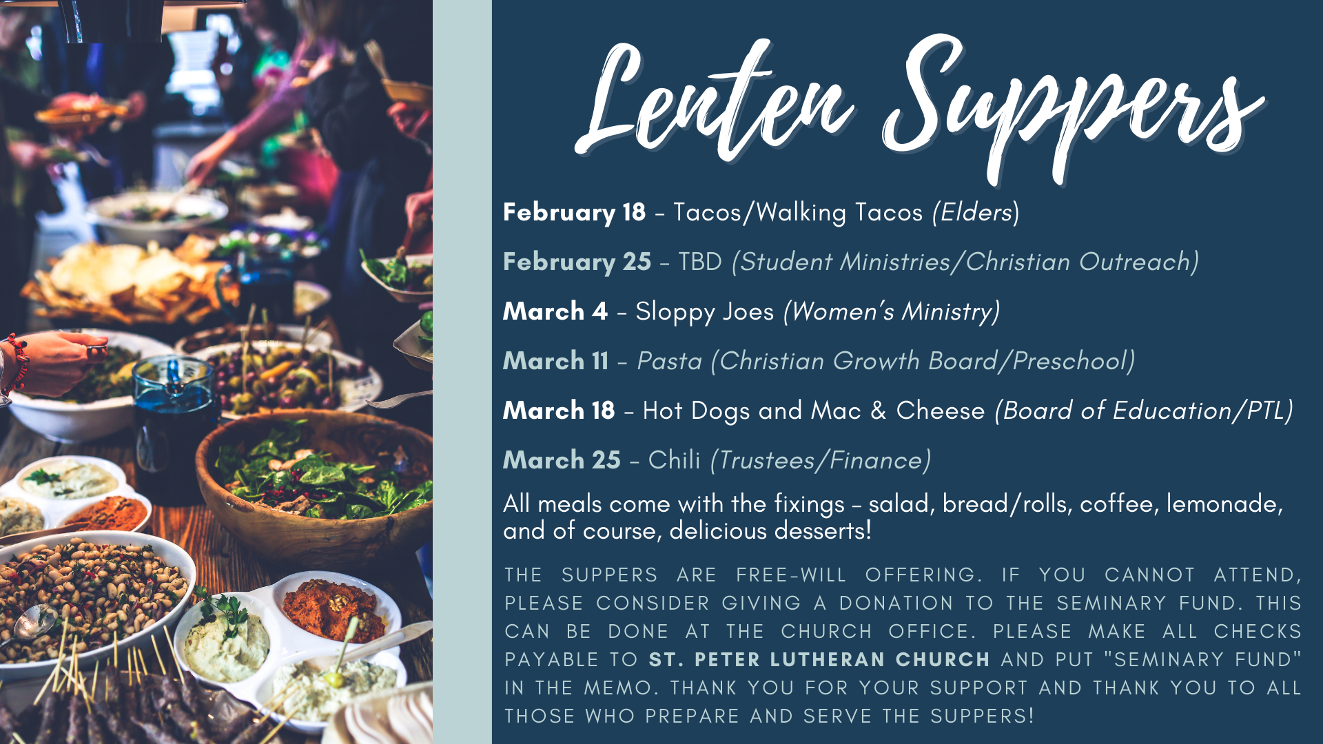 Join us Friday, March 6, 2026, at The Palazzo Grande for our Annual Spring Gala and Silent Auction. This wonderful event includes dinner, live entertainment, silent and live auction items, beautiful classroom projects made with love, and an all around amazing evening with our church and school community. All proceeds help our church and school minister to our students, staff, and entire church community.