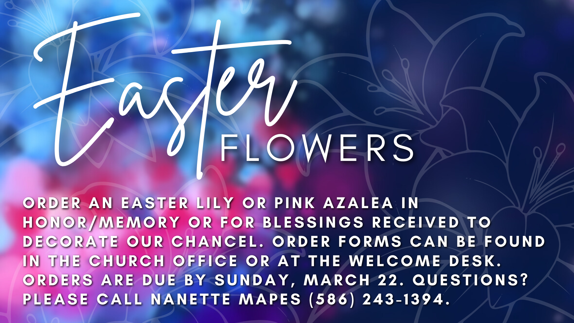 If you would like to order Hessell’s Greenhouse Easter Lilies or pink Azaleas in memory or honor of someone, or for blessings received, order forms are available in the Church Office or at the Welcome Desk. Flowers are used to decorate our chancel and may be picked up after the last Easter Service. The cost is $25 each and must be paid for when ordered. Please make checks payable to: Women’s Ministry. Deadline to order is Sunday, March 22. Questions? Please call Nanette Mapes 586 243-1394.