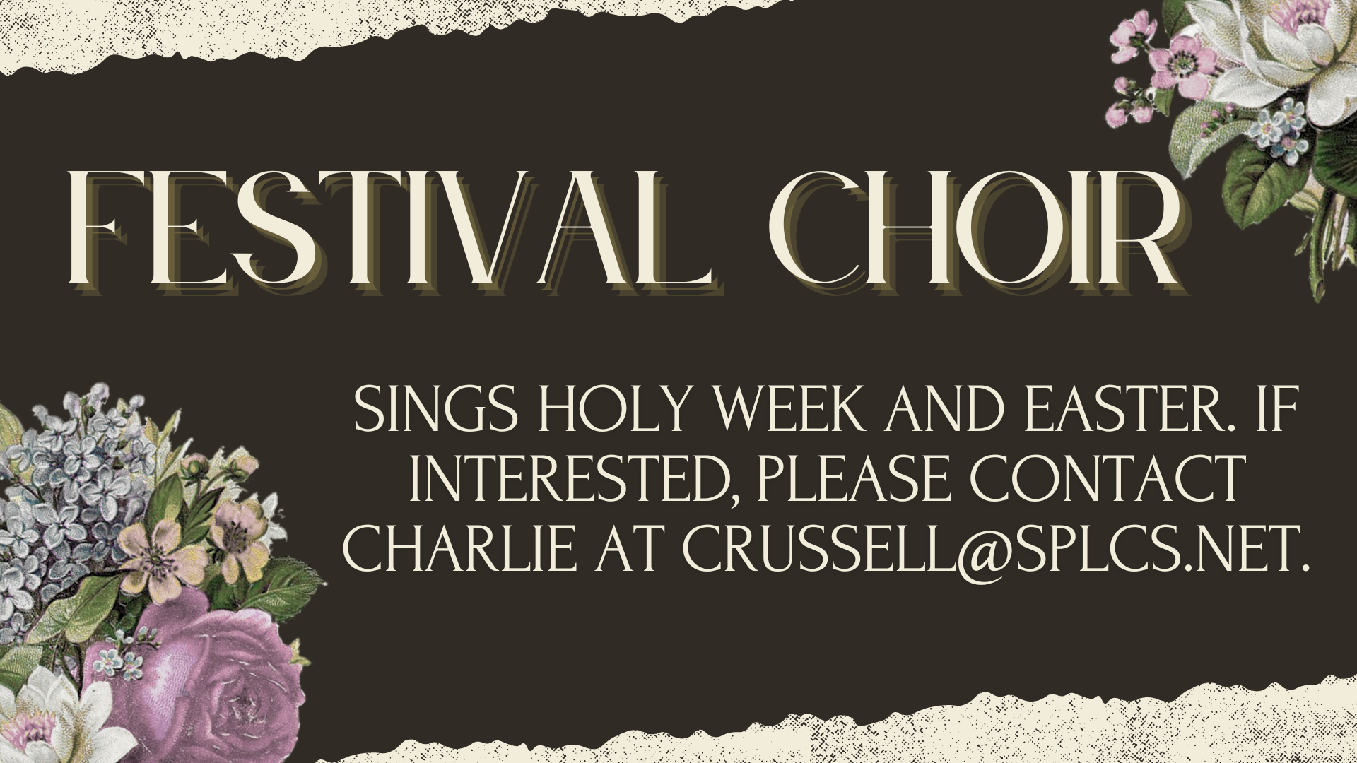 If you are interested in singing with the Festival Choir during Holy Week and Easter, rehearsals are held on Thursdays at 7:00 p.m. in the Music Room. Please contact Charlie Russell with any questions – crussell@splcs.net.