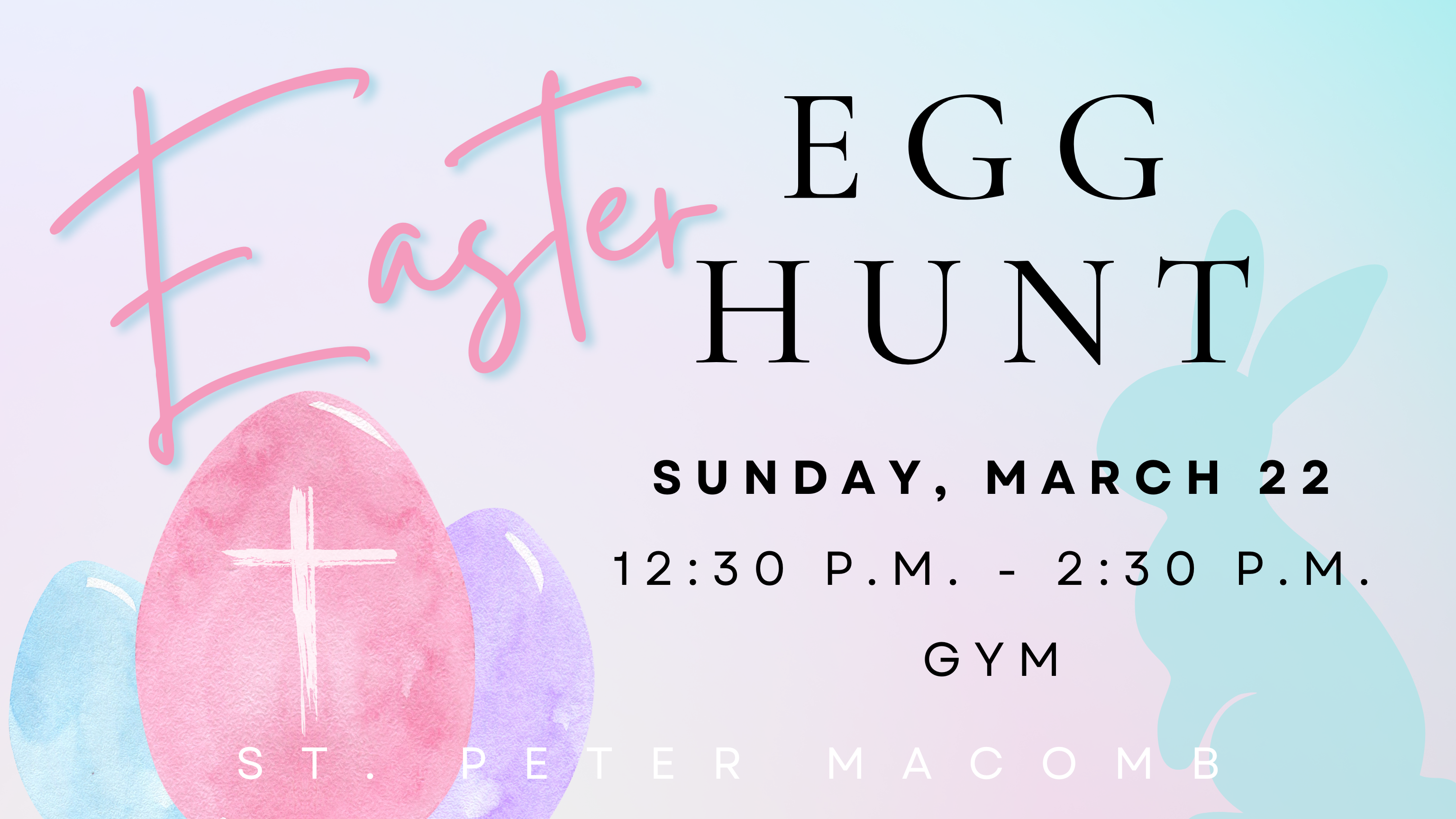 Join us Sunday, March 22, in the Gym from 12:30 p.m. – 2:30 p.m. for our annual Easter Egg Hunt!
