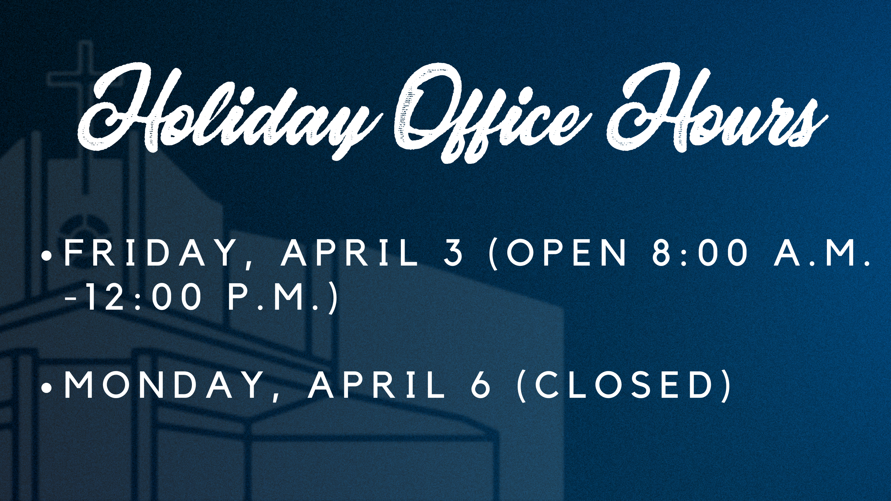 In observance of Easter weekend, our Church Office will close at noon on Friday, April 3 (Good Friday), and be closed on Monday, April 6.