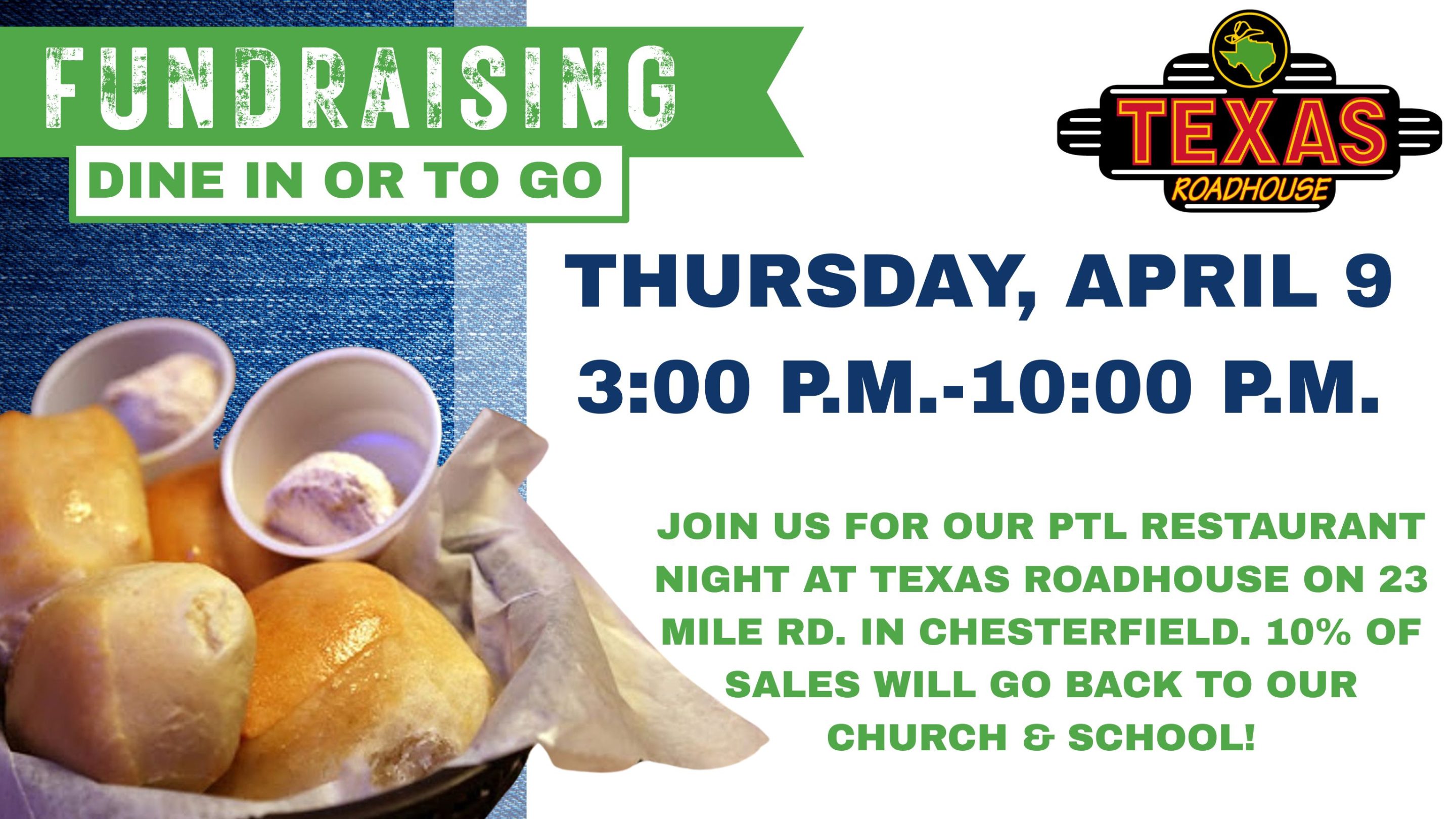 Have dinner with us on Thursday, April 9, from 3:00 p.m.-10:00 p.m. at Texas Roadhouse in Chesterfield. Be sure to present your flyer and 10% of all food purchases will go back to our church and school. Flyers are available at the Welcome Center or below. Thank you for your support!