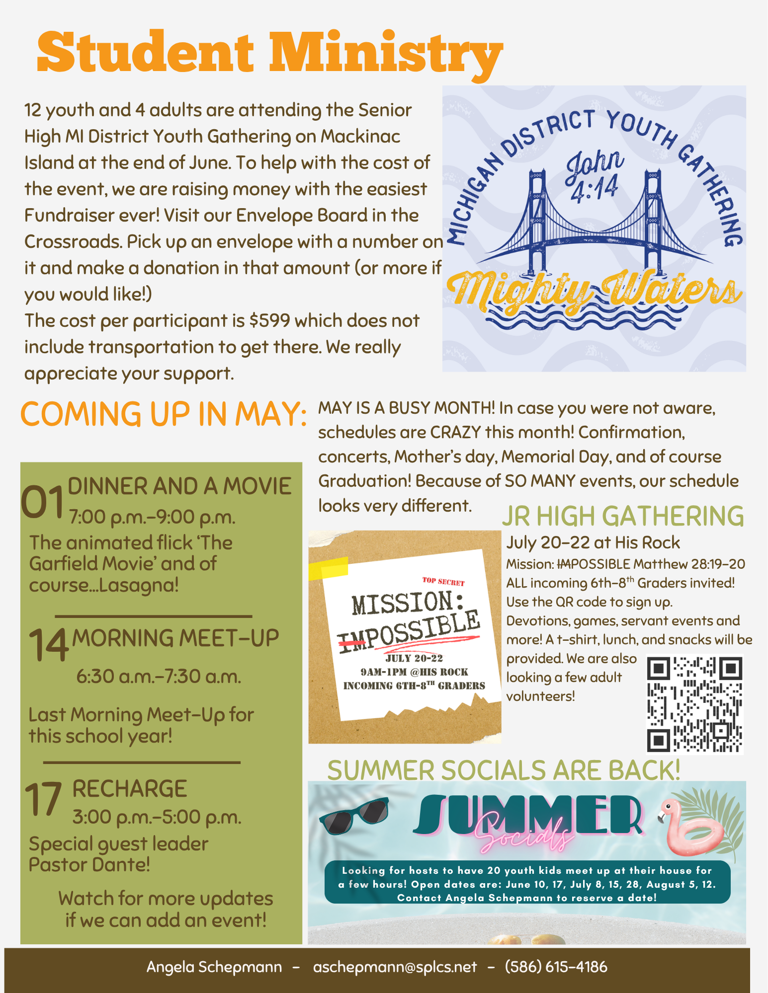 For more information or questions about our Student Ministries program, please send a message to studentministries@splcs.net or call our Church Office at (586) 781-3434.