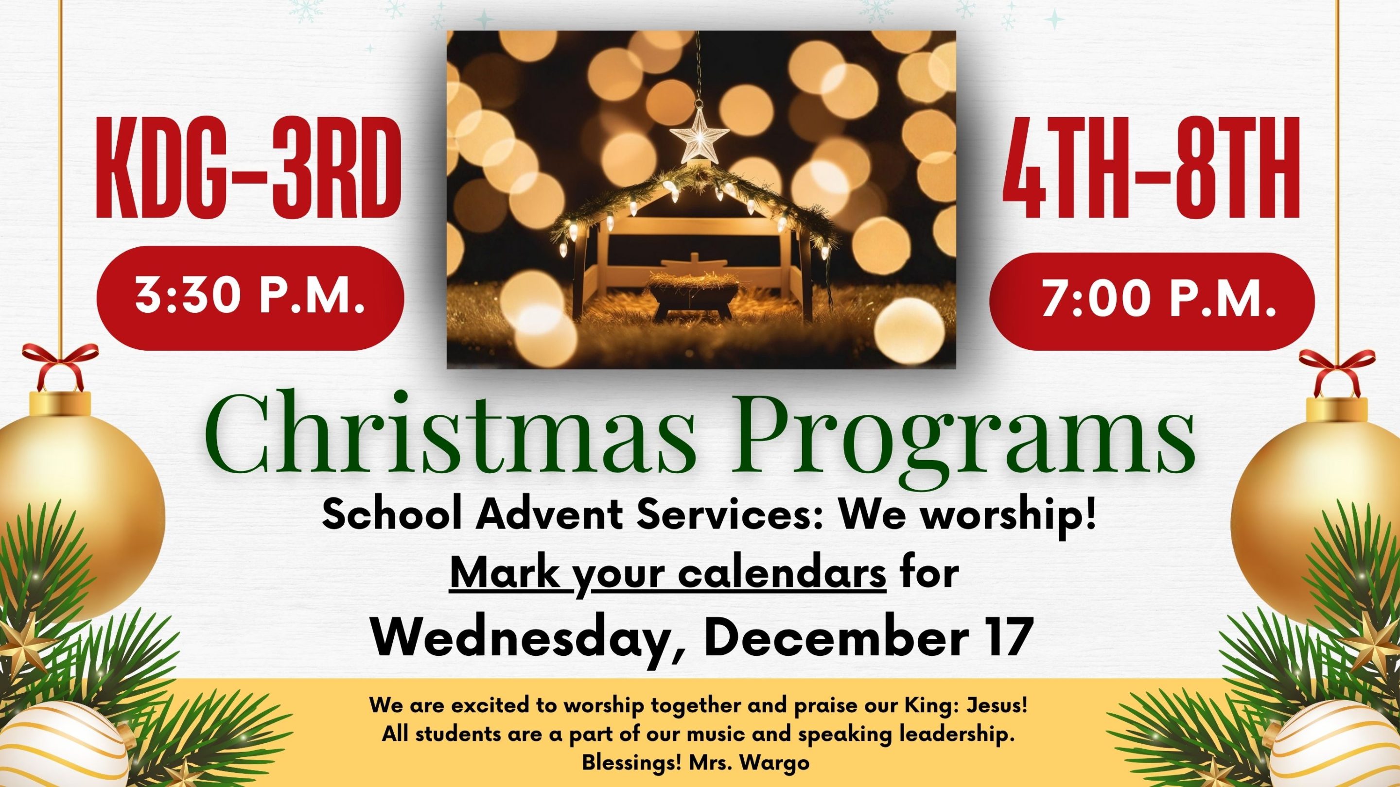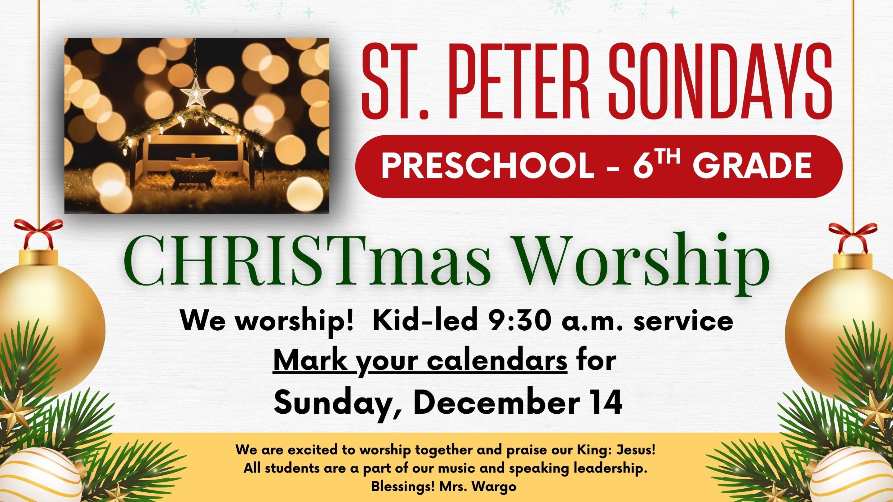 Join us December 17 for our Wednesday Advent services led by St. Peter students! Kindergarten through 3rd grade will lead 3:30 p.m. 4th through 8th will lead 7:00 p.m. Please be sure to come to one or both services as our students share the story of Christmas and the birth of our Savior Jesus–the greatest gift!