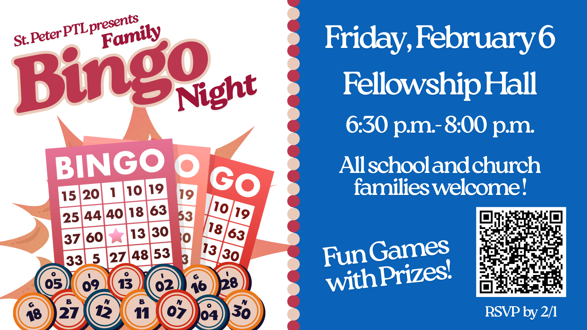 Join us Friday, February 6, from 6:30 p.m.-8:00 p.m. in the Fellowship Hall for Family BINGO Night! Enjoy a fun evening of fellowship, BINGO, and maybe even leave with a prize! Use the link below to RSVP by February 1!