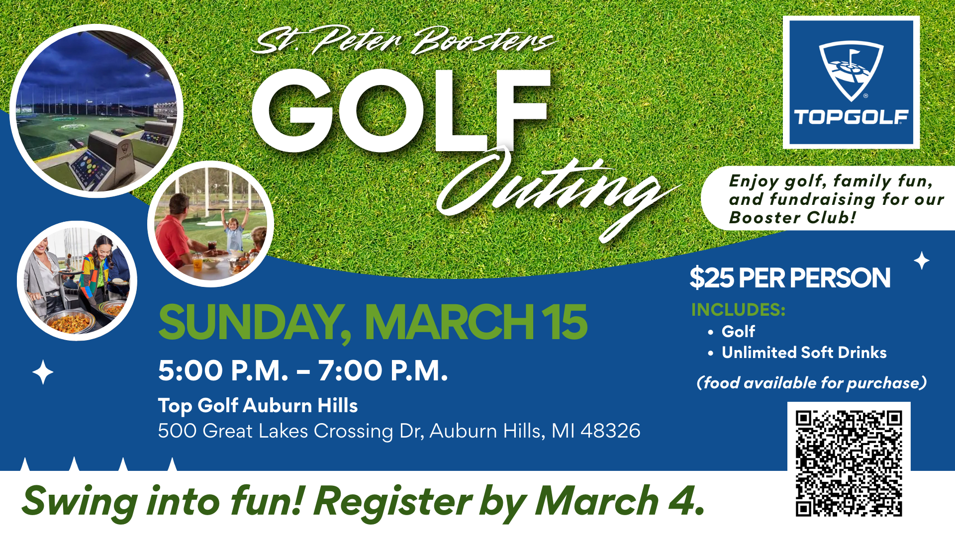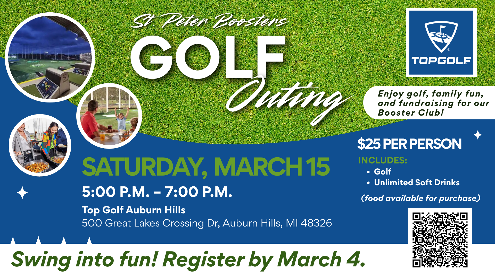 Our St. Peter Boosters Club invites you to an evening of fun for the entire family at Top Golf of Auburn Hills on March 15 from 5:00 p.m.-7:00 p.m. (check in begins at 4:45 p.m.)! Your family will receive two hours of unlimited game play and fountain beverages. Additional food and beverages will be available for purchase. Reserve your space by March 4. Questions? Contact St Peter Boosters Club at spmboosters@splcs.net or Rachel Samsel-Militello at samseldpm@gmail.com.
