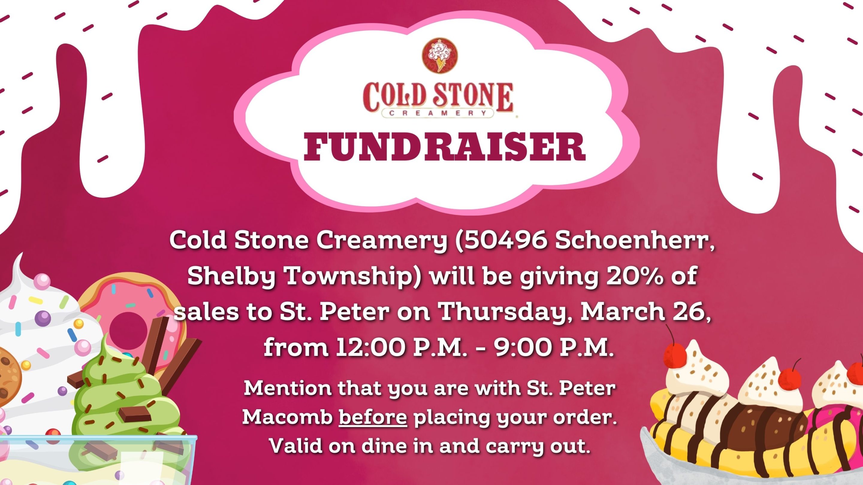 Cold Stone Creamery in Shelby Township will be giving 20% of sales to St. Peter on Thursday, March 26, from 12:00 p.m.-9:00 p.m. Mention that you are with St. Peter Macomb before placing your order. Valid on dine in and carry out. Bring your friends, bring your family, and let’s kick off Spring Break in the most delicious way possible!